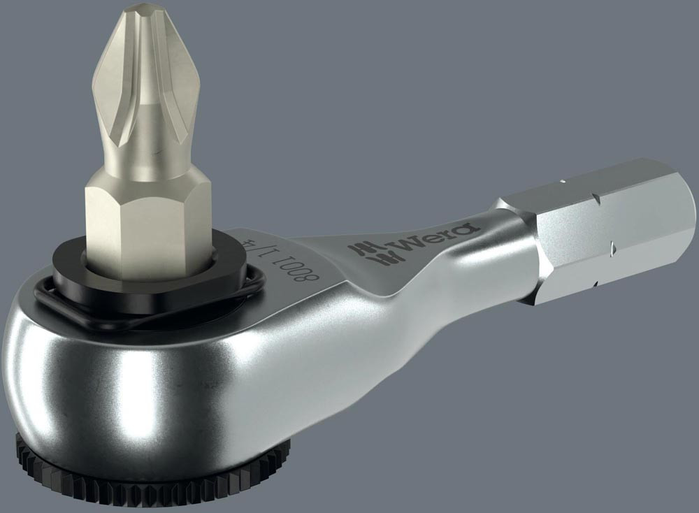 für Bit-Handhalter mit 1/4″ Aufnahme · gesenkgeschmiedete Vollstahlausführung · Feinzahnmechanik mit 60 Zähnen · Rückholwinkel 6° · Links/Rechtsumschaltung · ergonomisch geformter Knarrenkopf für 1/4″ Bits und mit Adapter auch für 1/4″ Nüsse und Bitnüsse