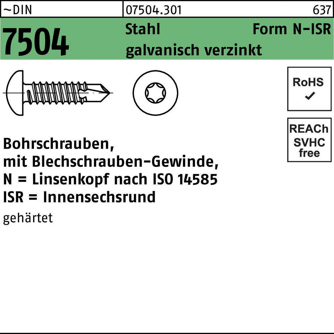 · Produkt-Typbezeichnung: Bohrschrauben, mit Blechschrauben-Gewinde, N = Linsenkopf nach ISO 14585 ISR = Innensechsrund