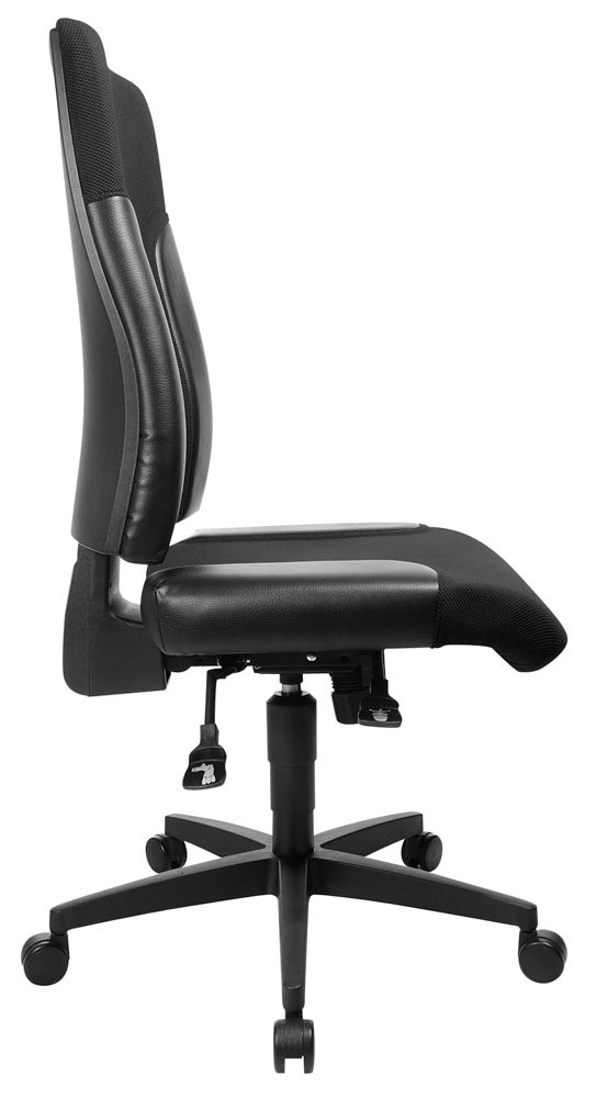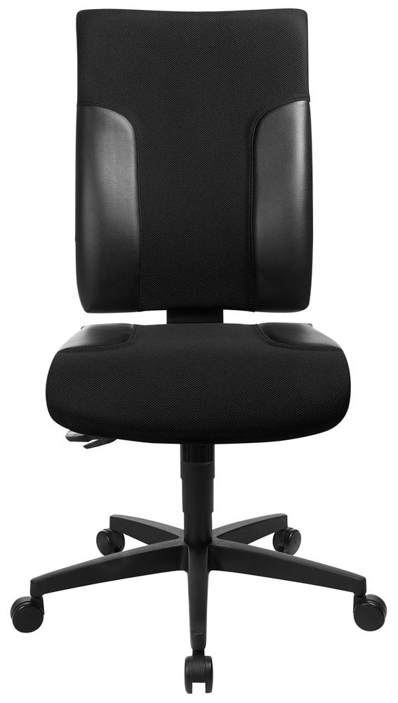 mit Synchron-Technik (ohne Armlehnen) · für überwiegend sitzende Tätigkeiten · Kunststoff-Fußkreuz schwarz · ergonomische Rückenlehne mit seitlichen Polstern zur Fixierung des Rückens · Muldensitz mit seitlichen Polstern zur Fixierung des Beckenbereichs · stufenlos höhenverstellbar · Rückenlehne in der Höhe verstellbar · Muldensitz mit seitlichem Formpolster · Bezug Rückenlehne 100 % Polyester, Sitzfläche 80 % Baumwolle, 20 % PU-Oberfläche · Sitzfläche B 480 x T 480 mm · Lehnenhöhe 550 mm · Rollen für weiche Böden Lieferung erfolgt zerlegt