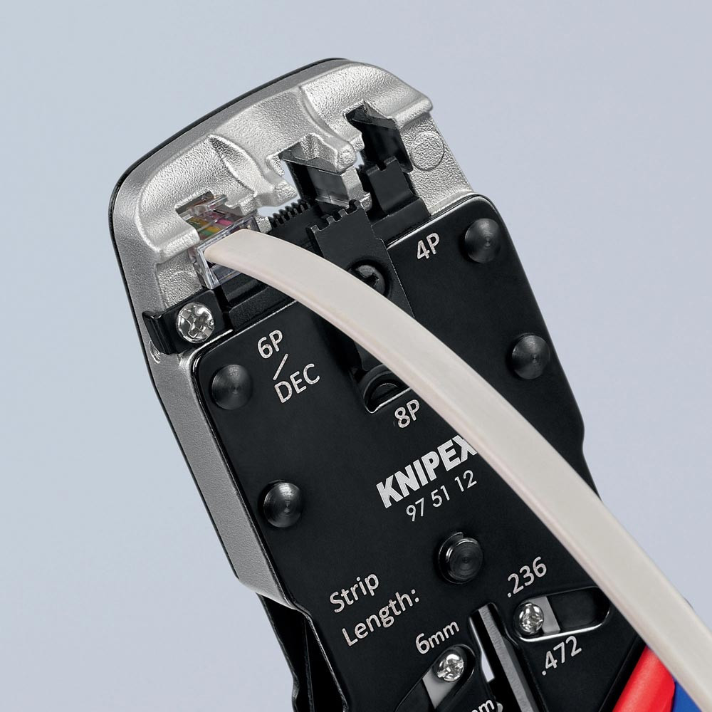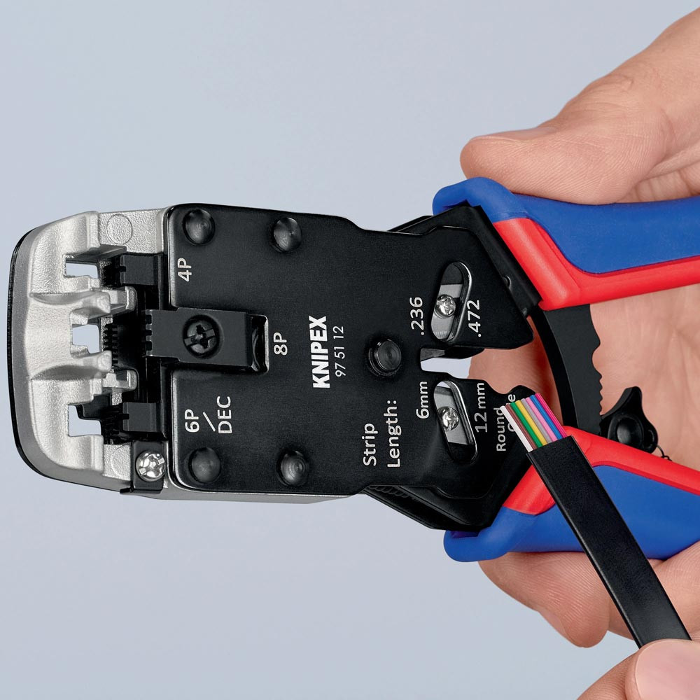 zum Schneiden und Abmanteln von flachem, nicht abgeschirmtem Telefonkabel und zum Verpressen von Westernsteckern Typ RJ 10 (7,65 mm breit), Typ RJ 11/12 (9,65 mm breit), und Typ RJ 45 (11,68 mm breit) · exakter Crimpvorgang durch Parallelcrimpung · gleichbleibend hohe Crimpqualität durch Zwangssperre (entriegelbar) · Kraftverstärkung durch Hebelübersetzung für ermüdungsarmes Arbeiten · mit Längsabschneider und Abmantelungsmesser für Flachbandkabel 6 mm und 12 mm Länge · mit Abisolierfunktion für Rundkabel