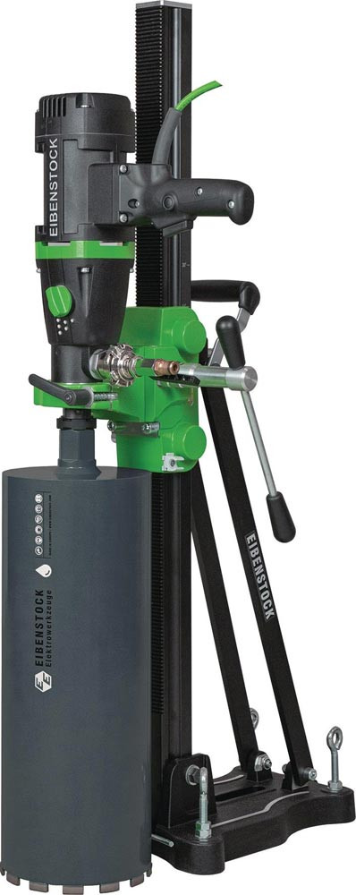 Elektronik-Sanftanlauf, Überlastabschaltung · Überlastanzeige · Abschaltkohlebürsten · 3-Gang-Ölbadgetriebe · mechanische Sicherheitskupplung · Kombispindel mit integrierter Aufnahme für Zentrierstange · integrierte Libellen auf Maschine und am Schlitten · PUR Baustellenkabel · Bohrsäule schwenkbar bis 45 ° · Kombifuß · einfache Bedienung und Transport · nachrüstbare Radachse · Einsatzbereiche: Nass/Trockenbohren in Beton Klinker Naturstein Asphalt, ideal für Hoch- und Tiefbau, Sanität- Heizung und Lüftungsbau