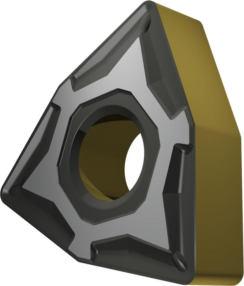 Doppelseitige negative Drehwendeschneidplatte · 80° Trigon mit Innenkreisdurchmesser von 12.7mm · 4.76mm Dick · 1.2mm Radius · Indexgenauigkeit nach ISO-Toleranzklasse-M · Spanbrecher M mit verrundeter Schneidkante · im Substrat T9415 · MT-CVD beschichtet WC-Co Substrat im ISO-Bereich P05 -P30 · zum schlichten bis schruppen bearbeiten von Stählen