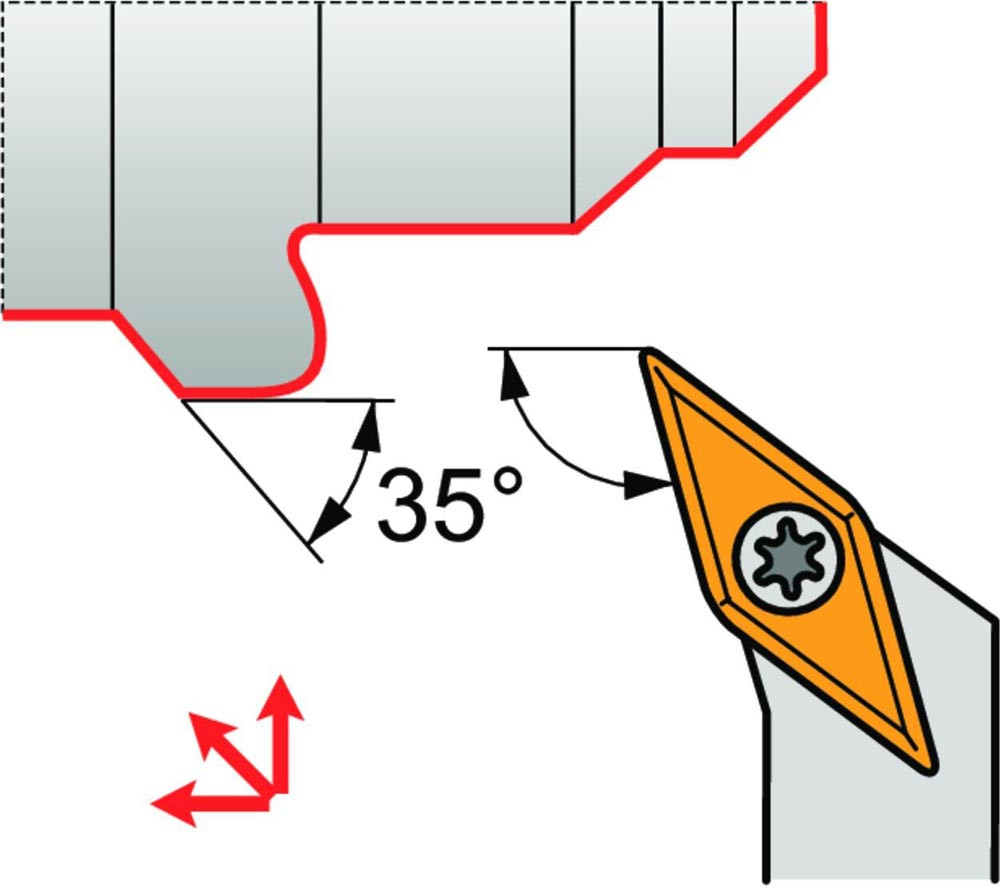 Dreh-Trägerwerkzeug mit Schraubklemmung zum spannen von 35° Rhombus positive Wendeschneidplatten mit einem Innenkreisdurchmesser von 6.35mm · 3.18mm Dick (ISO Bezeichnung VB.. 1103.. ) · linke Ausführung zum 107°30' Stirndrehen mit abgesetzem Schaft · 16mm Werkzeughöhe x 16mm Breite x 100mm Länge für Kegeldrehen · Kopierdrehen in einer und mehreren Richtungen und Längsdrehen mit und ohne Schulter