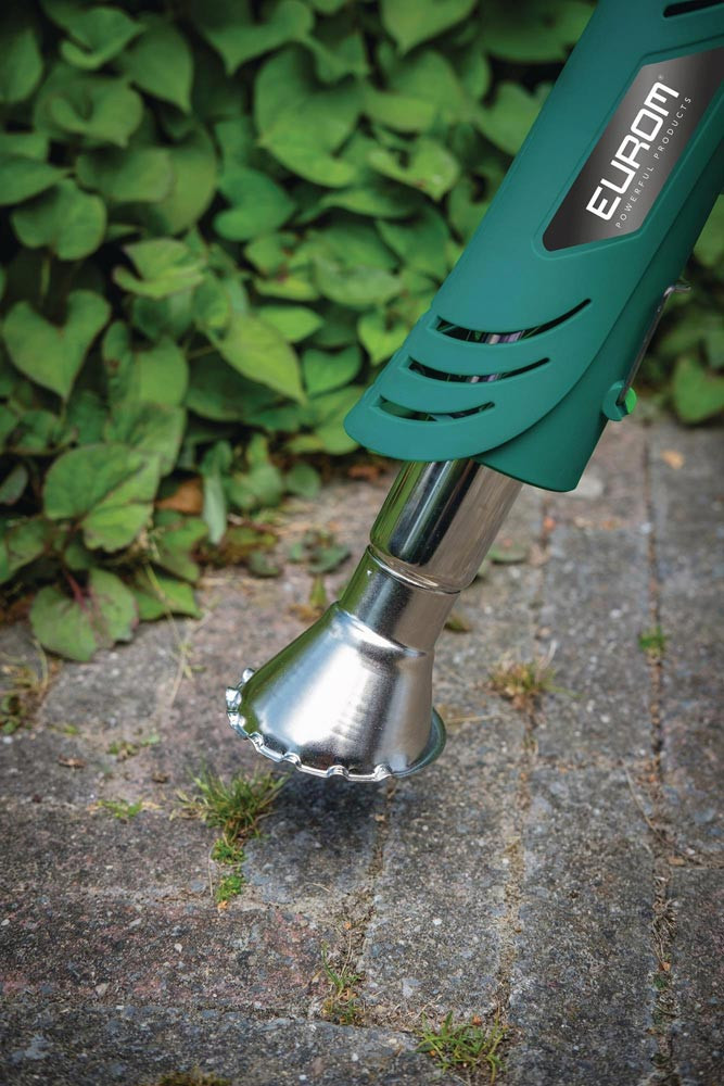 Der Eurom Electric Weedburner 2 in 1 ist ein elektrischer Unkrautbrenner mit 2000 Watt Leistung · Wenn Sie den Unkrautbrenner nur 5 Sekunden lang über das Unkraut halten, brechen die Zellen des Unkrauts und es stirbt ab · Dadurch ist der elektrische Weedburner schnell und effektiv zu bedienen