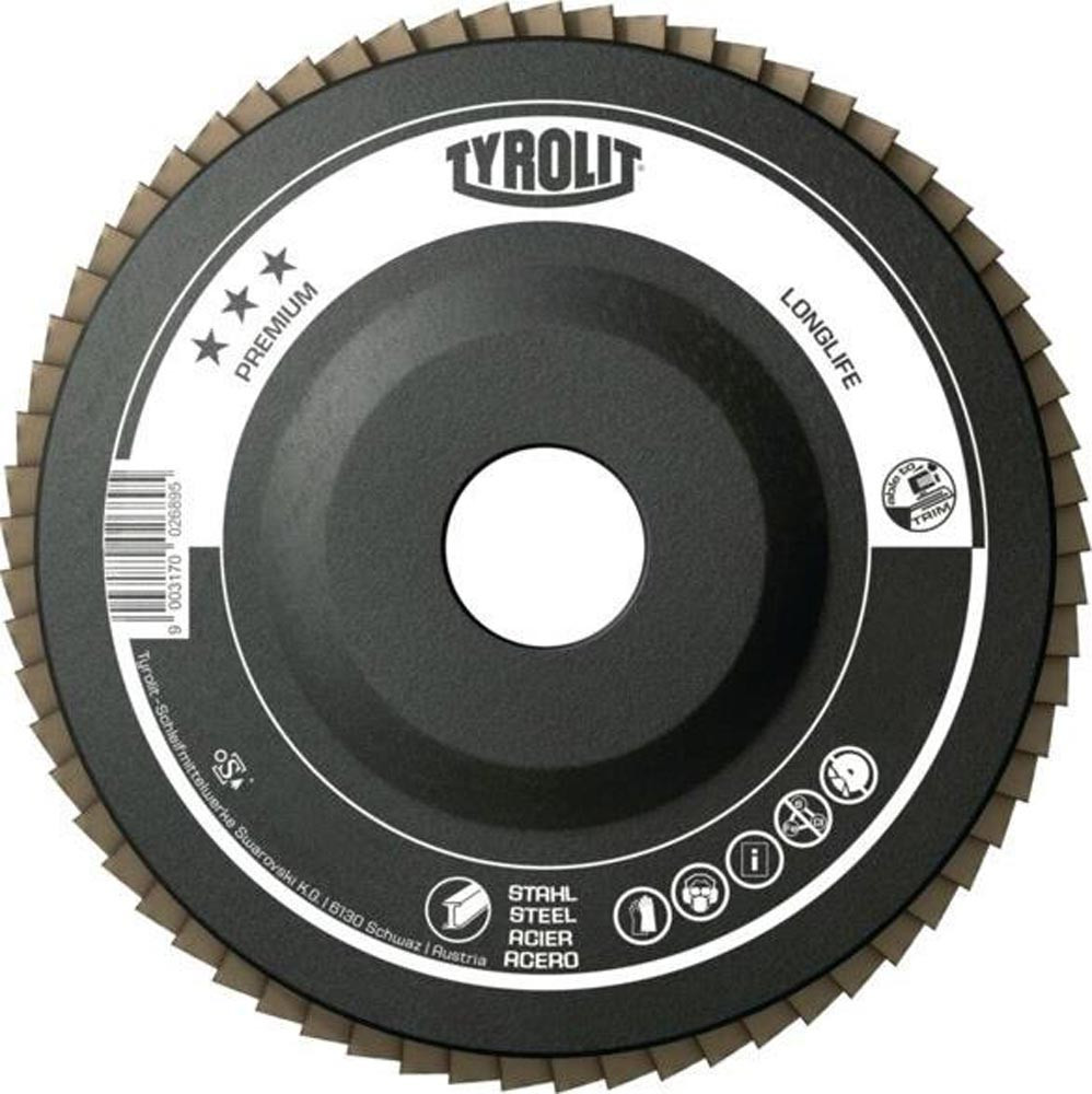 PREMIUM LONGLIFE ist eine Hochleistungs-Fächerscheibe für Stahl und bietet herausragende Abtragsleistung und höchste Lebensdauer · Materialabtrag von mehr als 4000 g · aus Naturfaser gefertigter Trägerkörper verleiht dem Werkzeug zusätzliche Flexibilität · so passt sich die Scheibe perfekt an die Werkstückoberfläche an und erzeugt saubere Schleifübergänge · für anspruchsvolle Schleifanwendungen auf verschiedenen Stahlqualitäten · für den Flächenschliff und zur Schweißnahtbearbeitung · Bohrung 22,23 mm Ø