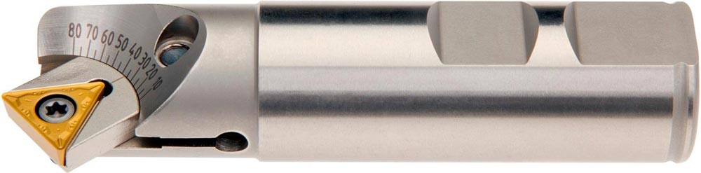 Entgratfräser mit doppelt negativer Geometrie zum spannen von 1 Stück TCMT 16T304E-FM:T83.. oder TCMT 16T308E-FM:T83.. einseitigen Wendeschneidplatten · Schnittdurchmesser 5 bis maximal 31mm mit 10 -80° Anstellwinkel und 25mm Weldon Schaft gemäß DIN 1835B · 100mm Gesamtlänge zum Entgratfräsen mit einer maximalen Schnitttiefe von 8.5mm