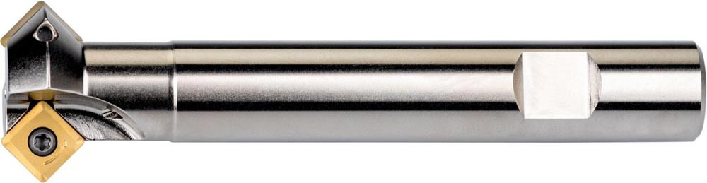 Entgratfräser mit doppelt negativer Geometrie zum spannen von 1 Stück SOMT 09T3.. einseitigen Wendeschneidplatten · Schnittdurchmesser 8 bis maximal 20.5mm mit 45° Anstellwinkel und 16mm Weldon Schaft gemäß DIN 1835B · 90mm Gesamtlänge · Kühlkanalbohrung zum Entgratfräsen mit einer maximalen Schnitttiefe von 4.5mm