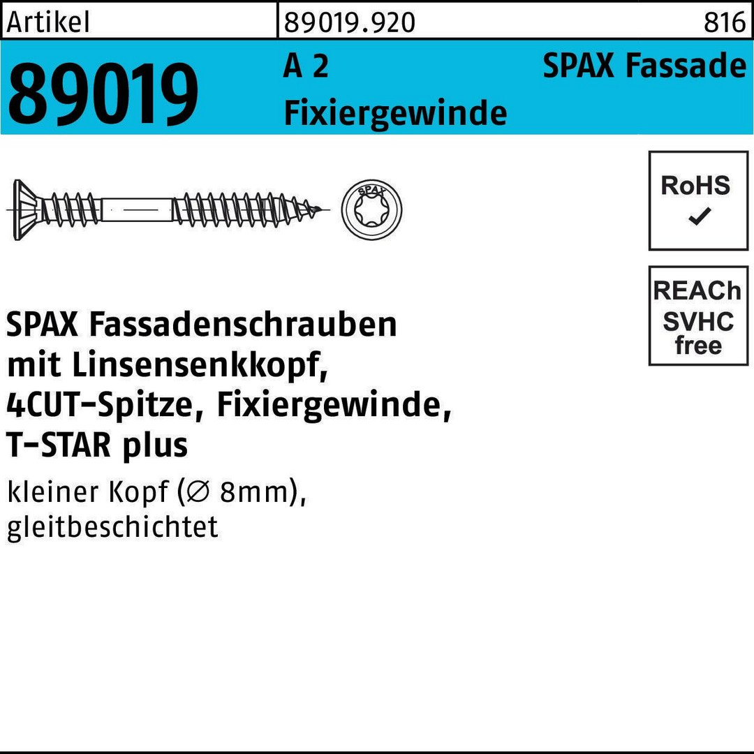 Fassadenschraube R 89018 LISEKO T-STAR 4,5x 50/32-T A 2 200 Stück SPAX 8000232975