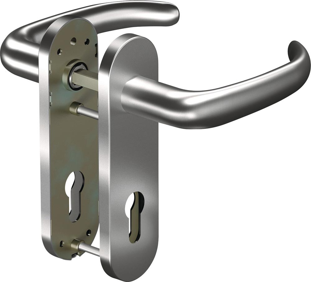 Feuerschutz-Kurzschild-Garnitur · DIN links / rechts · Vierkant 9 mm · Entfernung 72 mm · Drückergarnitur = beidseitig Drücker / Wechselgarnitur = außen Knopf 3020 · für Türstärke 38-63 mm · entspricht der EN 179 · Hochhaltefedern einseitig (Durchgangsseite)
