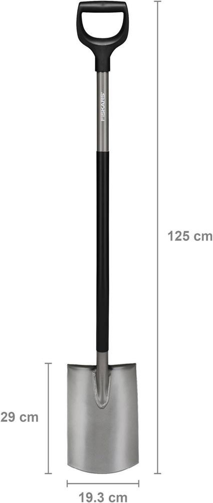 besonders geeignet zum Graben und Rasenstechen · ergonomische Form · Stiellänge 1250 mm · sehr stabil durch qualitativ hochwertigen Borstahl · geschärfte Blattkante · ergonomischer Schaftwinkel mit SoftGrip™ am Schaft · Trittfäche für leichtes Einstechen in den Boden