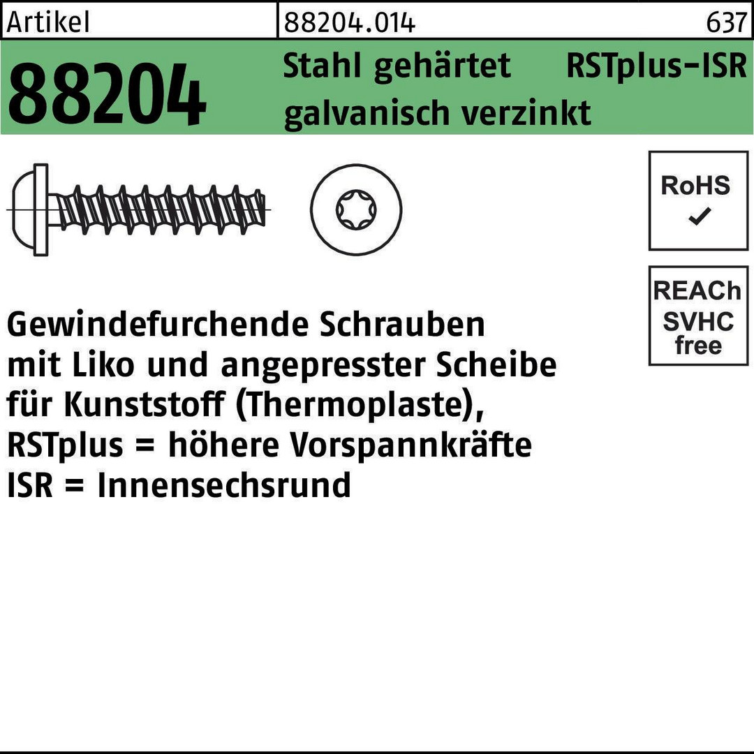 | Typenbezeichnung | Gewindefurchende Schrauben mit Liko und angepresster Scheibe für Kunststoff (Thermoplaste), RSTplus = höhere Vorspannkräfte ISR = Innensechsrund |