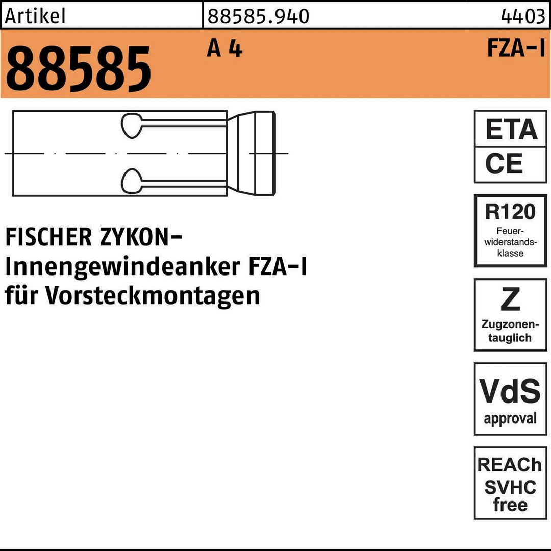 Artikel 88585 A 4 FZA-I FISCHER ZYKON- Innengewindeanker FZA-I für Vorsteckmontagen - Abmessung: 14 x 60 M 8 I VE=S (20 Stück )