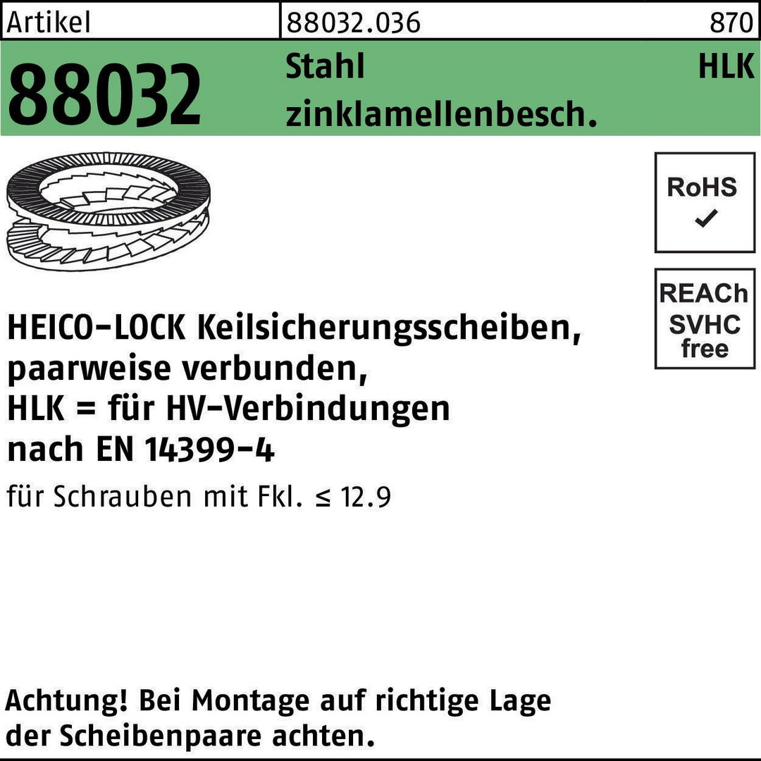 | Typenbezeichnung | HEICO-LOCK Keilsicherungsscheiben, paarweise verbunden, HLK = für HV-Verbindungen nach EN 14399-4 |