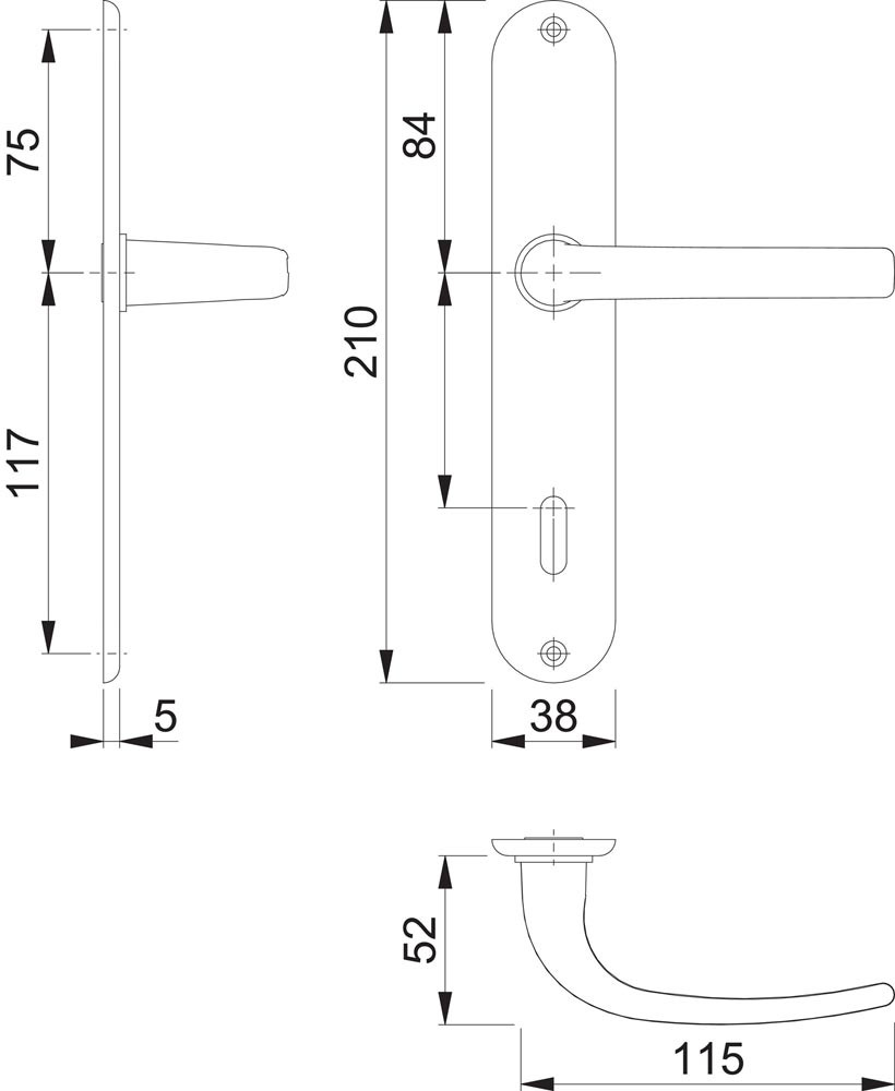 für Zimmertüren · Drückerlänge 115 mm · mit 8 mm Profilstift-Verbindung · für Türstärke 37 - 42 mm · Langschild: Länge 210 mm, Breite 38 mm · Schilder sichtbar verschraubt