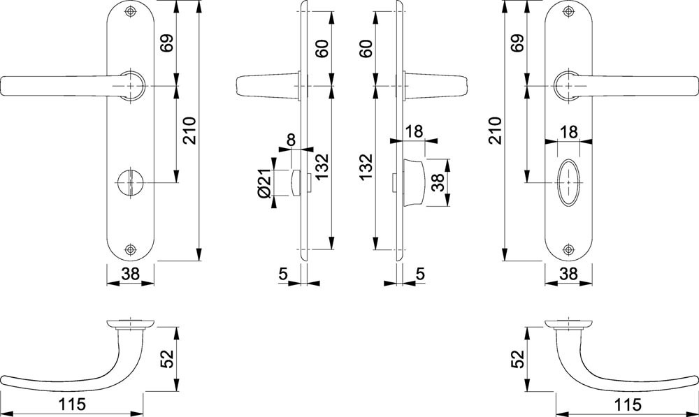 für Zimmertüren · Drückerlänge 115 mm · mit 8 mm Profilstift-Verbindung · für Türstärke 37 - 42 mm · Langschild: Länge 210 mm, Breite 38 mm · Schilder sichtbar verschraubt