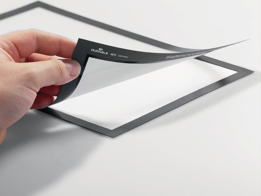 selbstklebend · mit vollflächiger Selbstklebefolie auf der Rückseite, zur Anbringung auf glatten Oberflächen · der Rahmen lässt sich rückstandslos lösen und an anderer Stelle wieder anbringen · Rahmen beidseitig farbig · einfaches und schnelles Austauschen durch aufklappbare, magnetische Vorderseite · auf Glasflächen beidseitig lesbar · VE = 2 Stück
