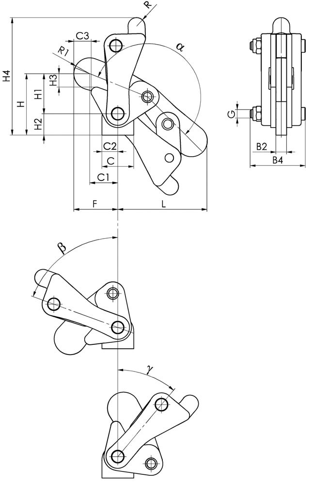 mit Schwenkfuß, schweißbare Ausführung · Getriebe unter Winkelstellung anschweißbar · geriebene und einsatzgehärtete Lagerbuchsen · gehärtete, geschliffene und dauerhaft gefettete Bolzen · Klemmmutter am Hebelarm für einstellbare Gängigkeit · Werkstoff: Stahl, brüniert · Hebelarm aus Stahlguss, brüniert