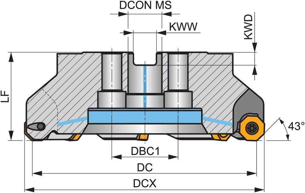 Planfräser mit doppelt negativer Geometrie welche 14 aus ONMX 0605.. · ONMX 0605..-W oder SNMX 1705.. doppelseitige Wendeschneidplatte · Schneiddurchmesser 250mm bis maximal 260,8mm mit 43° Anfahrwinkel und 60mm Bohrung gemäß DIN 8030-C · 63mm funktional und · durchgehende Kühlung und ungleicher Teilung zum Planfräsen und Entgratenmit einer maximalen Schnitttiefe von ON.. 4mm · SN.. 7mm