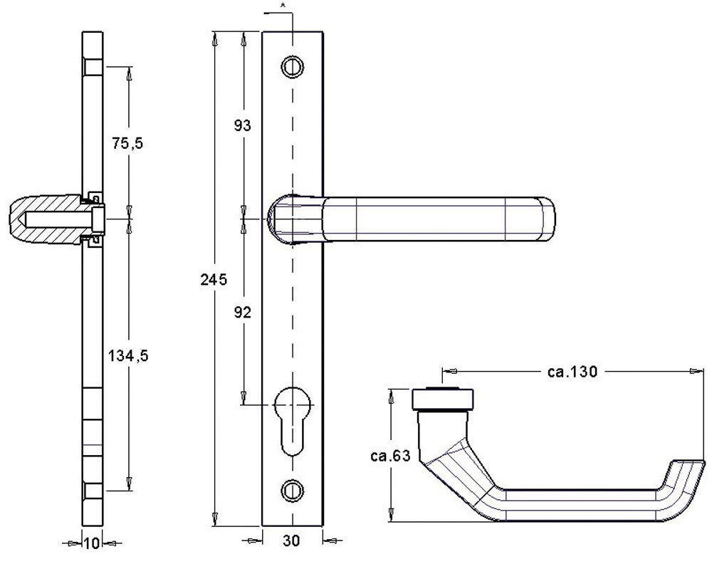 für Rahmentüren · Entfernung 92 mm · Vierkant 8 mm · PZ-gelocht · Drücker fest-drehbar gelagert · massive Schilder · eckig · Stärke 10 mm · Höhe 245 mm · Breite 30 mm · Verschraubung von innen nach außen · innen sichtbar verschraubt · für Türstärke 68-75 mm · DIN links / rechts · Lieferung inkl. Stift und Schrauben
