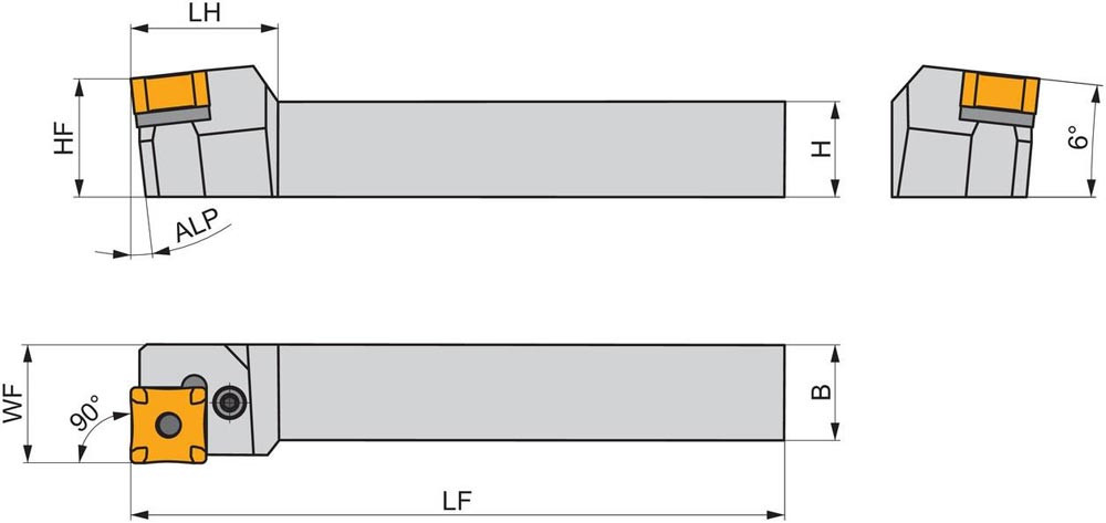 Kniehebel Scarfing Trägerwerkzeug mit 6° Freiwinkel für quadratische Wendeschneidplatten mit einer Hauptschneidenlänge von 25.4mm (Bezeichnung SNMX 25-R.. ) · Linke Ausführung mit Wendeschneidplatte parallel zum Schaft · Höhe 32mm · Breite 32mm und 250mm lang zum entgraten von Rohren und Röhren