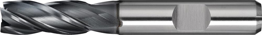 HSS-Co PM · ALCRONA-beschichtet · DIN 844 · Typ N · Vierschneider · kurz · Zentrumschnitt · Zylinderschaft mit Mitnahmefläche · rechtsschneidend · zum Fräsen von Werkstoffen mit geringer und mittlerer Festigkeit bis ca. 1000 N/mm² · Vibrationsreduktion durch ungleich geteilte Schneiden · verbesserte Werkzeugsteifigkeit durch konischen Spannutengrund