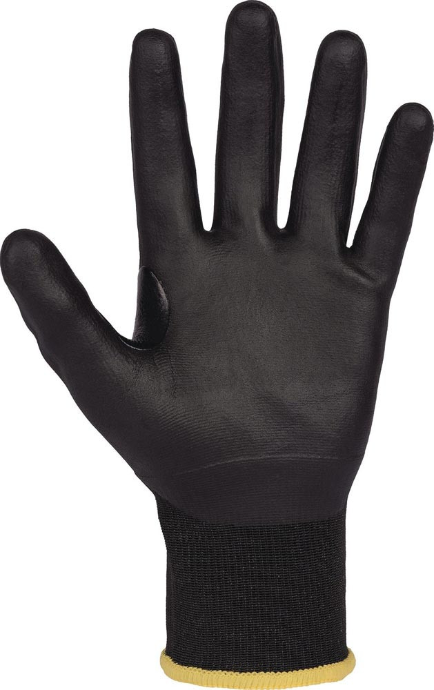 nach EN 388 · EN 407 · EN 16350 · Kat.II · Material: recyceltes Polyester (18 gg) und Stahlfasern · nahtlos gestrickt, Nitril-Mikroschaumbeschichtung und Daumenverstärkung · Schnittschutzlevel A/A1 · antistatisch nach EN 16350 · touchscreenfähig · Kontakthitzelevel 1 · silikonfrei · schwarz mit Farbcodierung · lebensmittelgeeignet · zertifiziert nach Oeko-Tex®
