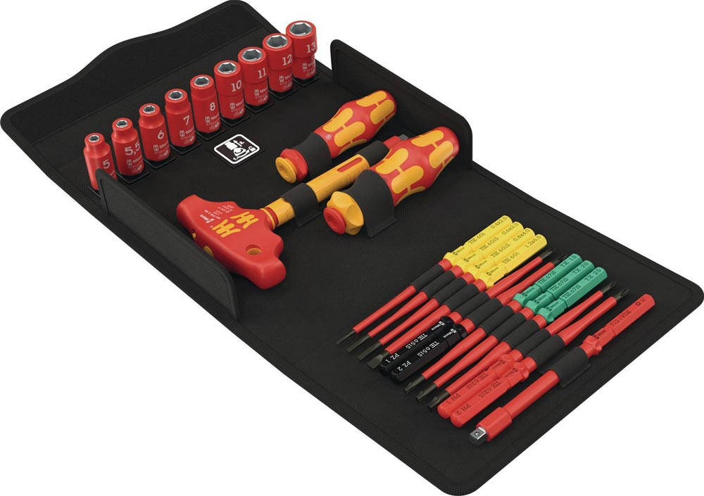 25-teilig · Allround-Set für sicheres Arbeiten unter Spannung – ideal für Elektro-Profis · alle Werkzeuge stückgeprüft nach IEC 60900 bei 10.000 V – für sicheres Arbeiten bis 1.000 V · 2 Handhalter: - 837 i RA mit Ratschenfunktion (40 Zähne, 9° Rückholwinkel), - 817 VDE – beide für VDE-Wechselklingen geeignet · Quergriff-Ratschenschraubendreher (410 i VDE A RA) für 1/4″-Steckschlüsseleinsätze und Bitnüsse · Adapterklinge (Kraftform Kompakt A VDE 712 i) – adaptiert von 1/4″ Außensechskant auf 9 mm Außensechskant · 11 VDE-Wechselklingen (157 mm) mit Zwirbelfunktion, Abrollschutz und „Take it easy“-Werkzeugfinder (Farbcode + Größenlaserung) · 9 Zyklop-Steckschlüsseleinsätze mit 2-Komponenten-Isolation: gelber Sicherheitskern unter roter Isolierung – bei Beschädigung sofort sichtbar · platzsparend in robuster Textilbox, andockbar an Wera 2go oder per Klett an Werkstattwagen/Wand befestigbar