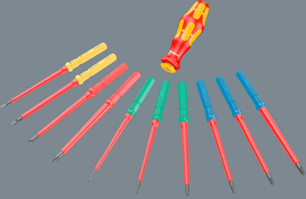 mit 2 Handhalter 817 VDE Kraftform, 24 VDE-Wechselklingen (jeweils 157 mm lang), größtenteils mit reduziertem Klingendurchmesser (iS), so dass auch tiefliegende Schraub- und Federelemente erreicht und betätigt werden können · VDE-isoliert bis 1000 V · gefertigt gem. IEC 60900, stückgeprüft · Größenleitsystem - Take it easy Tool Finder System: Farbkennzeichnung nach Profilen und gelaserter Größenangabe · Kraftform-Plus-Griff für ergonomisches Arbeiten, gegen Blasen und Schwielen · harte Griffzonen für hohe Arbeitsgeschwindigkeit, weiche Griffzonen für hohe Drehmomentübertragung · Abrollschutz verhindert lästiges Wegrollen am Arbeitsplatz