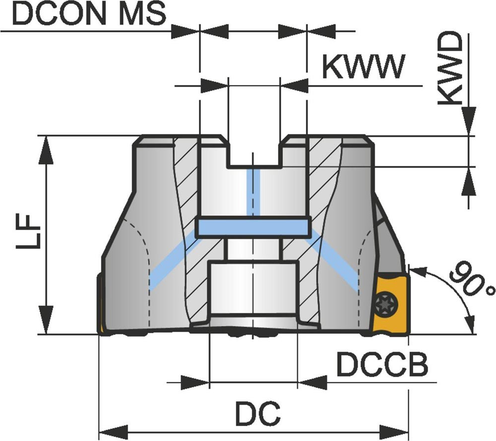 Eckfräser mit doppelt negativer Geometrie zum spannen von 6 Stück LNGX 1205.. oder LNGU 1205.. doppelseitigen Wendeschneidplatten · Schnittdurchmesser 100mm mit 90° Anstellwinkel und 32mm Verbindungsbohrung gemäß DIN 8030-A · 50mm Überstandslänge · Kühlkanalbohrung und ungleiche Teilung zum flachen Schulterfräsen · flachen Nutfräsen und Tauchfräsen mit einer maximalen Schnitttiefe von 9.0mm