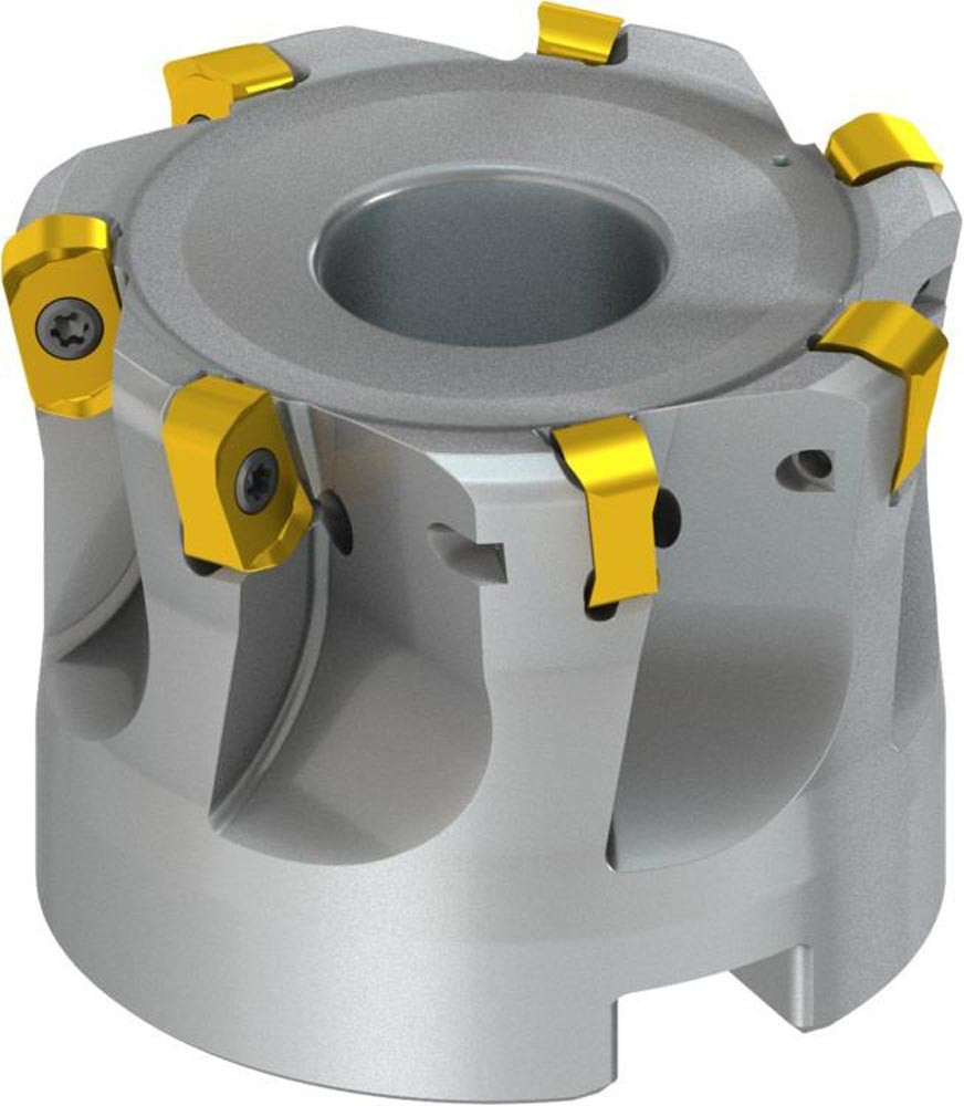 Hochvorschubsfräser mit doppelt negativer Geometrie welche 7 aus BNGX 10T3.. Wendeschneidplatte · Schneiddurchmesser 47mm bis maximal 52mm mit 29° Anfahrwinkel und 22mm Bohrung gemäß DIN 8030-A · 40mm funktional und · durchgehende Kühlung und ungleicher Teilung zum Planfräsen · flachen Schulterfräsen · Tauchfräsen · Kopierfräsen · Rampen · progressiven Tauchfräsen und helikalen Fräsen mit einer maximalen Schnitttiefe von 1mm