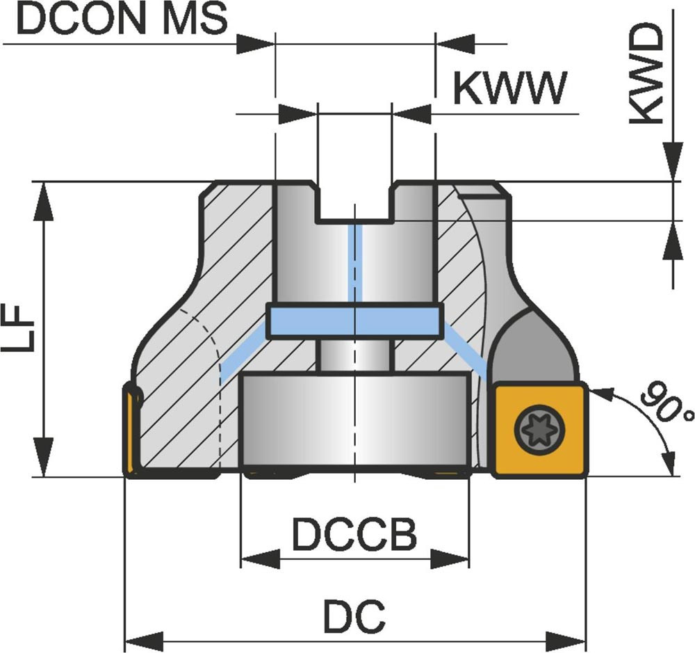 Eckfräser mit positiver/negativer Geometrie zum spannen von 6 Stück SDMT 1205.. einseitigen Wendeschneidplatten · Schnittdurchmesser 80mm mit 90° Anstellwinkel und 27mm Verbindungsbohrung gemäß DIN 8030-A · 50mm Überstandslänge · Kühlkanalbohrung zum flachen Schulterfräsen · flachen Nutfräsen und Tauchfräsen mit einer maximalen Schnitttiefe von 10.0mm