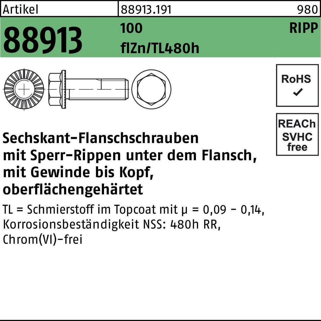 Sechskantflanschschraube R 88913 Sperr-Ripp VG M16x40 100 flZnnc 480h-L 50St.