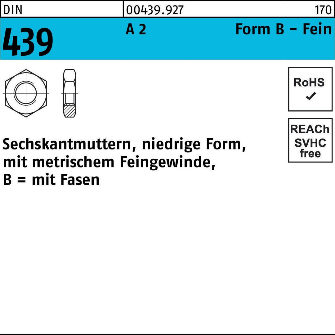 DIN 439 A 2 Form B Fein Sechskantmuttern · niedrige Form · mit metrischem Feingewinde · mit Fasen - Abmessung: BM 30 x 2 VE=S (10 Stück )