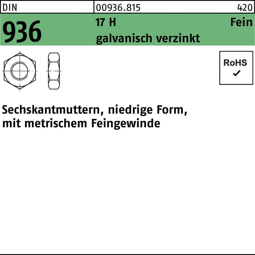 DIN 936 17 H Fein galvanisch verzinkt Sechskantmuttern · niedrige Form mit metrischem Feingewinde - Abmessung: M 20 x 1,5 VE=S (50 Stück )