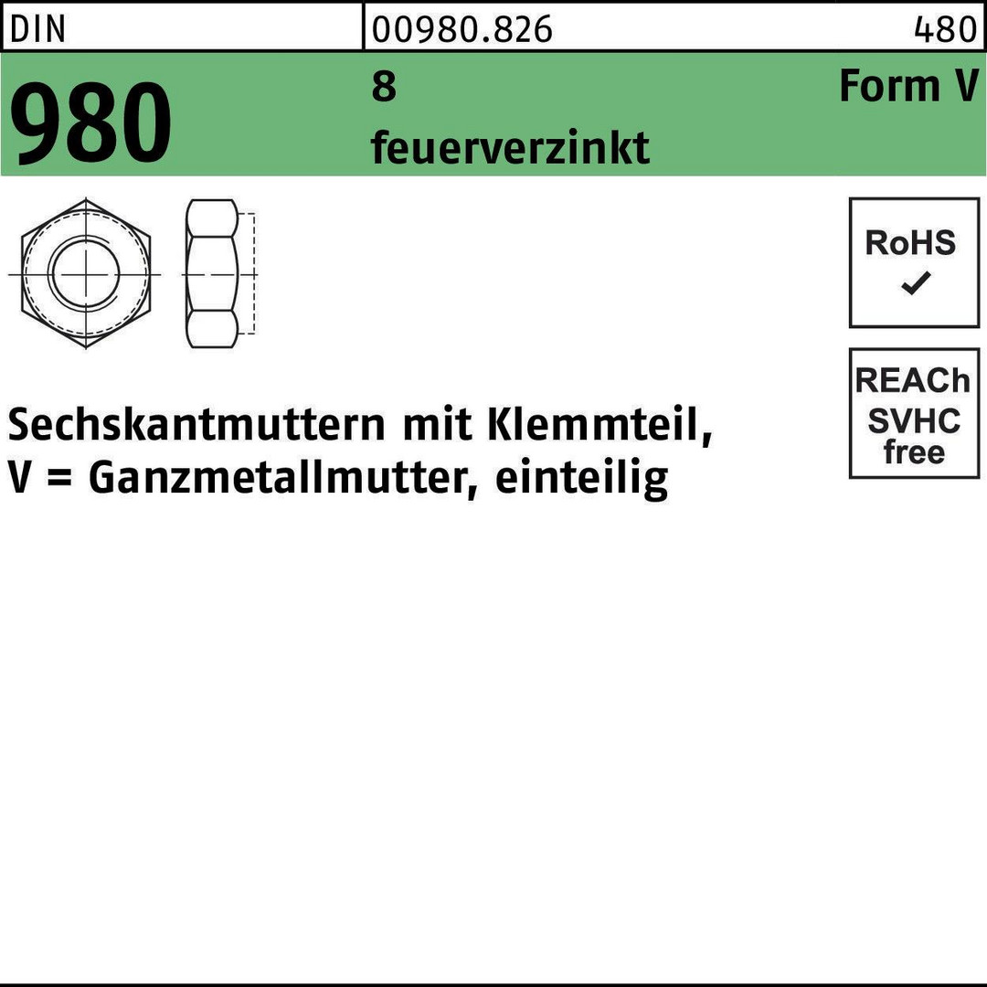 DIN 980 8 Form V feuerverzinkt Sechskantmuttern mit Klemmteil · Ganzmetallmuttern · einteilig - Abmessung: V M 5 VE=S (100 Stück )