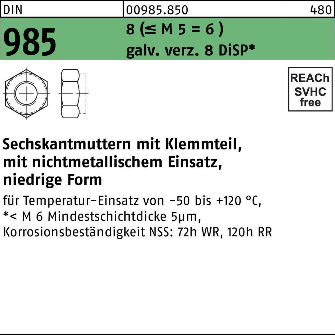 DIN 985 8 (<=M 5 = 6 ) galv. verz. 8 DiSP Sechskantmuttern mit Klemmteil · mit nichtmetallischem Einsatz · niedrige Form - Abmessung: M 16 VE=S (100 Stück )
