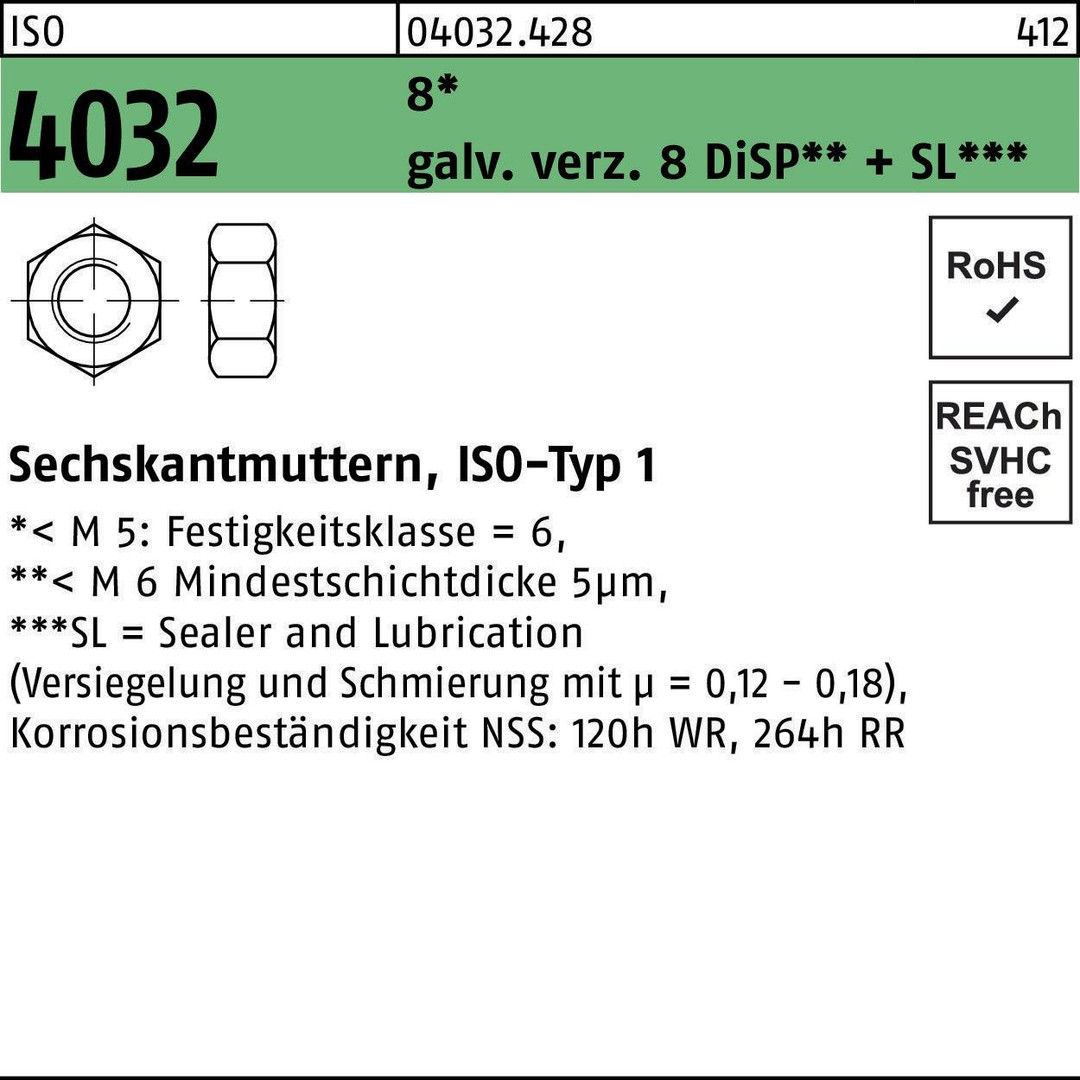 ISO 4032 8 galv. verz. 8 DiSP + SL Sechskantmuttern - Abmessung: M 5 VE=S (1000 Stück )