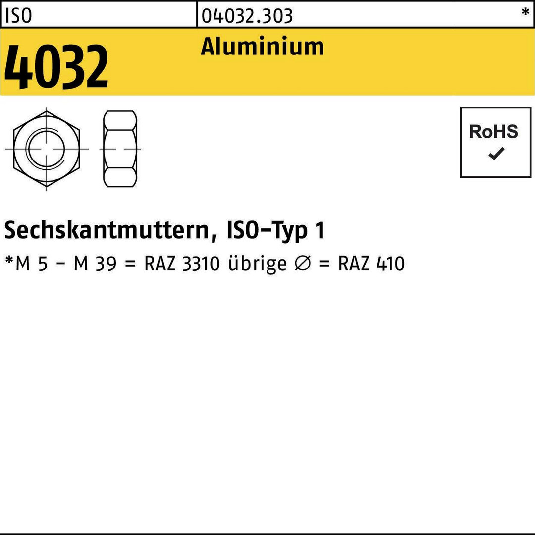 ISO 4032 Aluminium Sechskantmuttern · ISO-Typ 1 - Abmessung: M 6 VE=S (100 Stück )