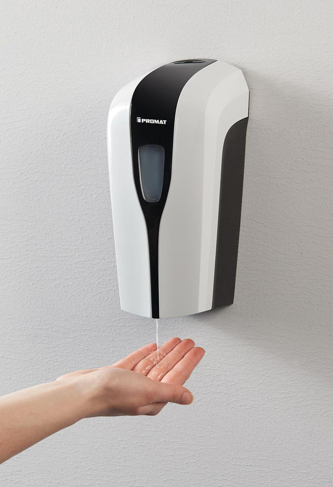 berührungsloser Spender, batteriebetrieben (mind. 4 Stück bis 8 AA Batterien), frei befüllbar, aus ABS-Kunststoff mit Wandhalterung und Befestigungsmaterial · Füllstandanzeige, abschließbar · zur Wandmontage oder Säulenmontage · einstellbare Dosiermenge 0,7 ml oder 1,4 ml · mit 1000 ml Vorratstank zum Nachfüllen · passend für Promat Spendersäule 6420520 · Einsatzbereiche: Kliniken, Arztpraxen, Gesundheits- und Pflegeeinrichtungen, Labors, Rettungswachen, Großküchen, Lebensmittelindustrie, und überall da, wo höchste hygienische Standards eingehalten werden müssen