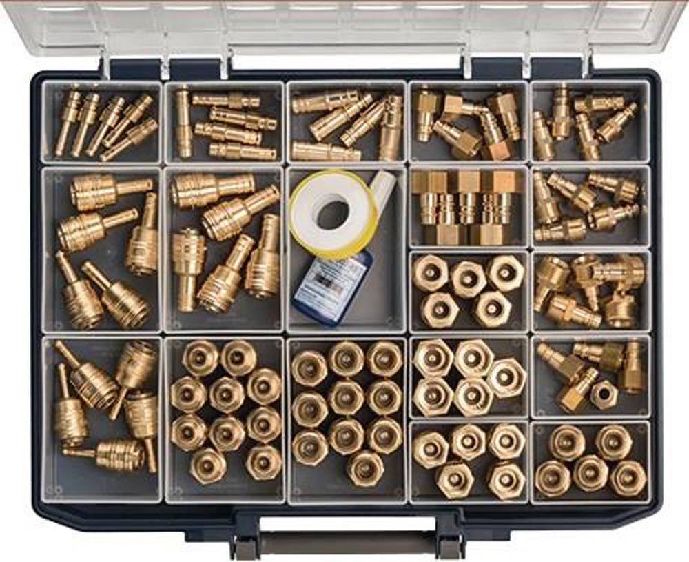 mit Schnellverschlusskupplungen und Stecknippel DN 7,2 · Messing blank · handliche, robuste und qualitativ hochwertige Kunststoff-Sortimentsbox mit den gängigsten Artikeln unserer Schnellverschlusskupplungen DN 7,2, Einstecktüllen und Nippel · die gängigsten Messingkupplungen DN 7,2 sowie die zugehörigen Stecknippel sind in 19 Kunststoffboxen übersichtlich präsentiert · alle Einsätze sind mit den Artikelnummern der beinhalteten Teile beschriftet