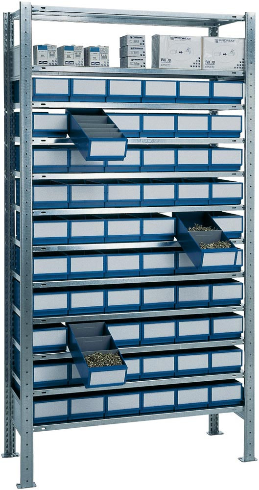komplett mit Regalkästen · verzinkt · Grund- und Anbauregal in Modulbauweise · einfache und schnelle Steckmontage mit vormontierten verzinkten Rahmen · Fachböden verzinkt mit verstärktem Kastenprofil, H 25 mm, höhenverstellbar im 25-mm Raster · Tragfähigkeit pro Fachboden 150 kg · Feldlast 1300 kg (bei gleichmäßig verteilter Last)