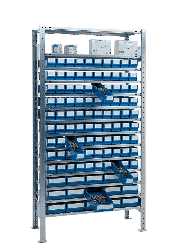 komplett mit PROMAT Lagerboxen und Sichtlagerkästen · einfache und schnelle Steckmontage mit vormontierten verzinkten Rahmen · Fachböden verzinkt mit verstärktem Kastenprofil, H 25 mm, höhenverstellbar im 25-mm-Raster · Tragfähigkeit pro Fachboden 150 kg · Feldlast 1300 kg