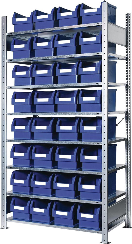 komplett mit Sichtlagerkästen Raster-Plan°· einfache und schnelle Steckmontage mit vormontierten verzinkten Rahmen · Fachböden verzinkt mit verstärktem Kastenprofil, H 25 mm, höhenverstellbar im 25-mm-Raster · Tragfähigkeit pro Fachboden 150 kg · Feldlast 1300 kg