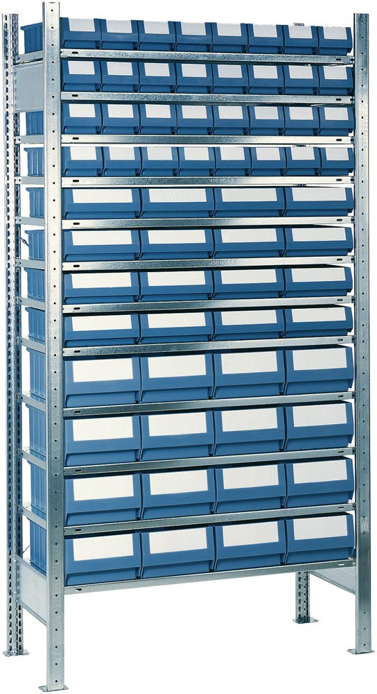 mit Regalkästen · einfache und schnelle Steckmontage mit vormontierten verzinkten Rahmen · Fachböden verzinkt mit verstärktem Kastenprofil, H 25 mm, höhenverstellbar im 25-mm-Raster · Tragfähigkeit pro Fachboden 150 kg · Feldlast 1300 kg