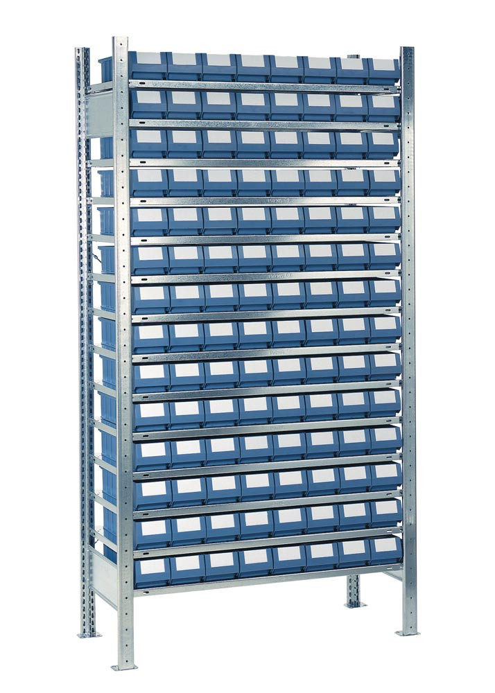 mit Regalkästen · einfache und schnelle Steckmontage mit vormontierten verzinkten Rahmen · Fachböden verzinkt mit verstärktem Kastenprofil, H 25 mm, höhenverstellbar im 25-mm-Raster · Tragfähigkeit pro Fachboden 150 kg · Feldlast 1300 kg