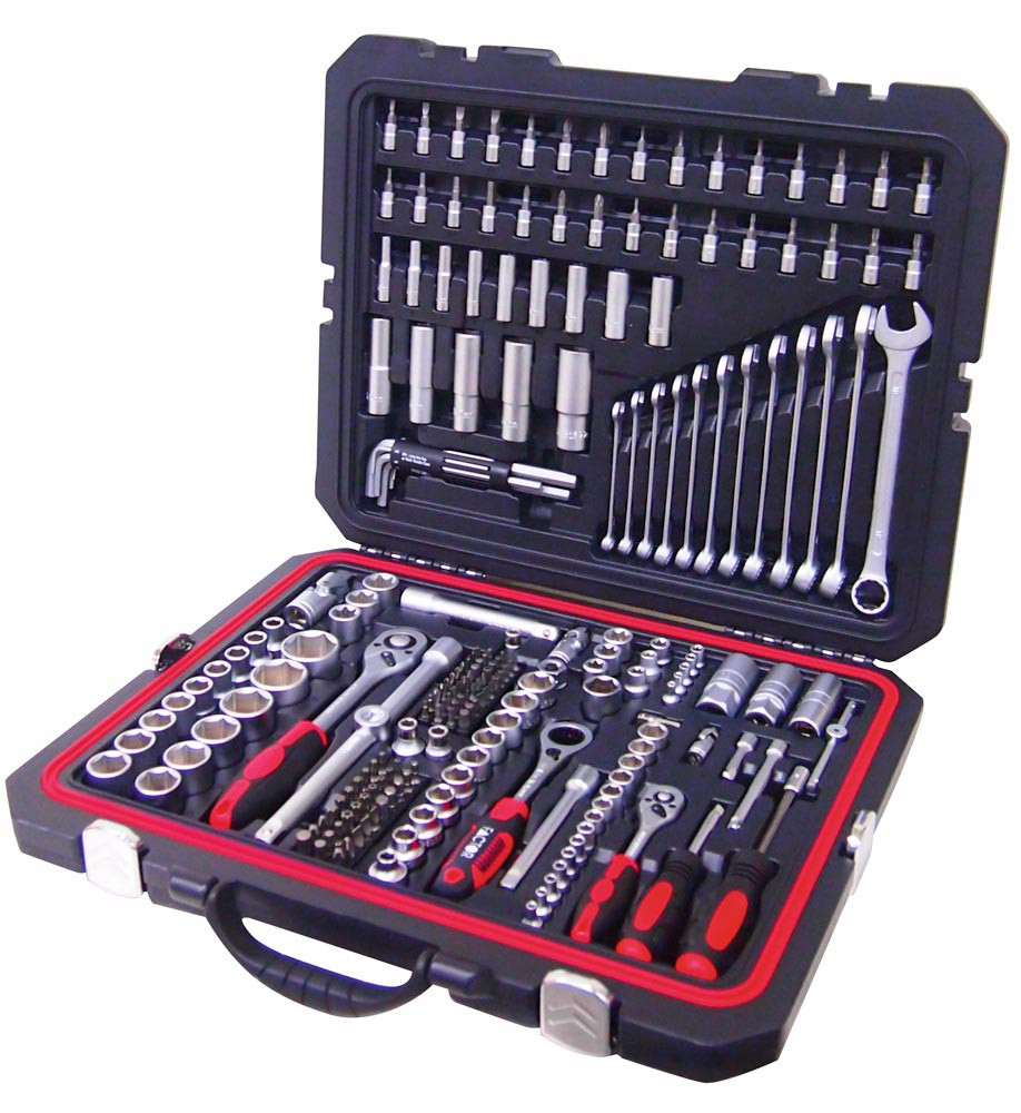 Ausführung: Bestehend aus Steckschlüsseleinsätzen und Betätigungswerkzeugen 1/4", 3/8" und 1/2" ∙ Aus Chrom-Vanadium-Stahl ∙ Knarren mit 72 Zähne, feinverzahnt ∙ Im hochwertigem spritz- und staubgeschütztem Tragekoffer mit ergonomischem Handgriff und 4 robusten Metallschließern