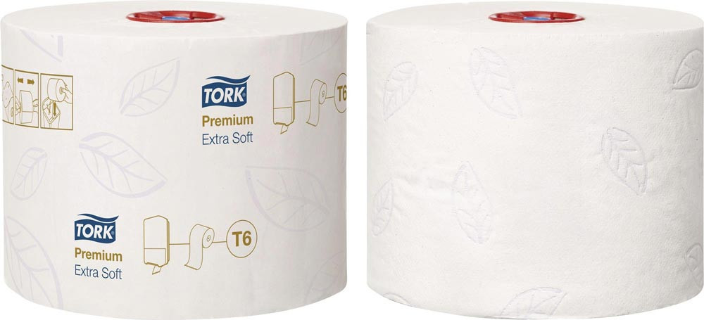 extra weiche Midi Toilettenpapierrolle · weiß · T6, 3-lagig · maximale Feuchtigkeitsabsorption · ideal für Waschräume mit niedriger bis mittlerer Besucherfrequenz · kompakte Rolle mit hoher Kapazität + Tork Easy Handling® Plastic Packaging für leichteres Tragen und Entsorgen der Verpackung