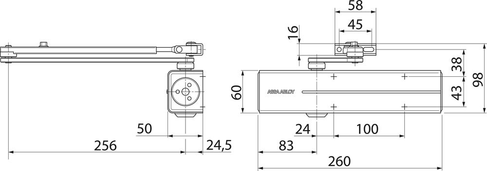 geprüft nach DIN EN 1154 · mit integrierbarer Montageplatte für Feuer- und Rauchschutztüren verwendbar · max. Höhenausgleich stufenlos 14 mm · Schließkraft stufenlos einstellbar · Schließgeschwindigkeit, Endschlag und Öffnungsdämpfung stufenlos von vorne einstellbar · DIN links und DIN rechts verwendbar · Maße: (B x H x T) 260 x 60 x 47 mm · Lieferung inkl. Gestänge
