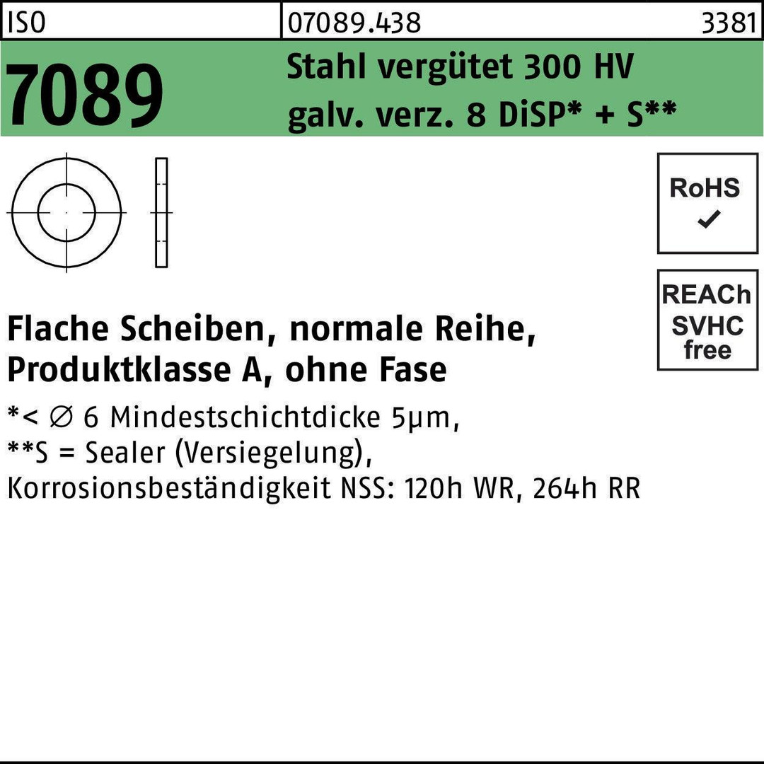 ISO 7089 Stahl 300 HV galv. verz. 8 DiSP + S Flache Scheiben · normale Reihe · Produktklasse A · ohne Fase - Abmessung: 24 VE=S (50 Stück )