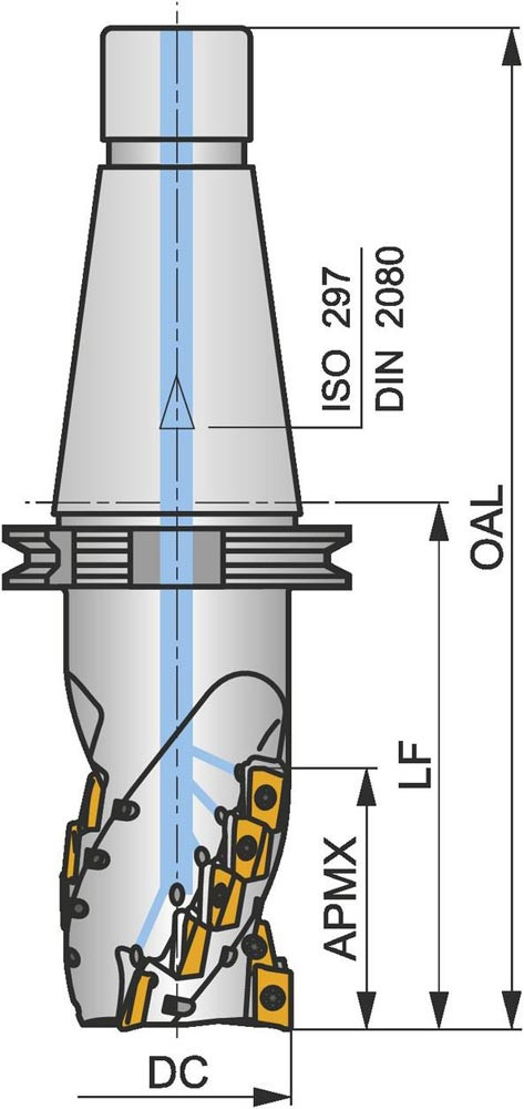 Walzenstirnfräser mit positiver/negativer Geometrie zum spannen von 18 Stück ADMX 16 oder ADEX 16 einseitigen Wendeschneidplatten · Schnittdurchmesser 50mm mit 90° Anstellwinkel und SK 50 Kegelschaft gemäß ISO 297 · 80mm Funktionslänge 267mm Gesamtlänge · Kühlkanalbohrung zum tiefen Schulterfräsen und tiefen Nutfräsen mit einer maximalen Schnitttiefe von 80mm